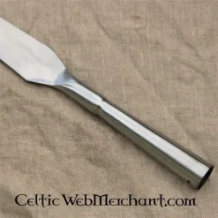 Produkt detaljer: Længde: 49 cm / Ringdiameter: 3 cm / Materiale: DA45 fjederstål hårdhed 48-50 HRC. / Kant: halvskarpt / skaft medfølger: nej / based on da historisk original: ja /