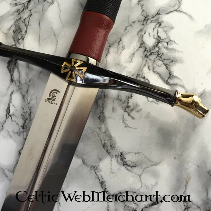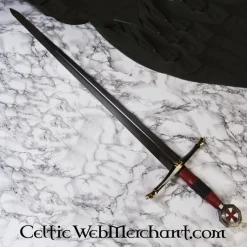Denne Tempelridder sværd er lavet af Toledo stål. Dens længde er 107 cm, og det er rigt udsmykket. Den har en smuk åben Knap, der giver det en kraftfuld, men elegant udseende. Enderne af cross-vagter har løvehoveder.
