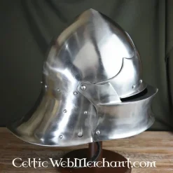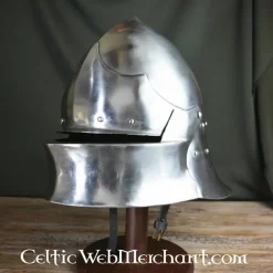 Denne hjelm er lavet af 2 mm tyk stål og er forsynet med en læder speeches. Visiret kan åbnes og hjelmen kan nemt kombineres med en bevor at beskytte halsen og hagen.