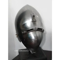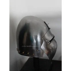 Dette er en komplet kamp-klar kopi af en tysk flad bascinet lavet af 2 mm tykt stål. Det er lavet af to dele, der er svejset sammen. Visiret er aftagelige og lavet af ét stykke. Hjelmen har en læder speeches til komfort.