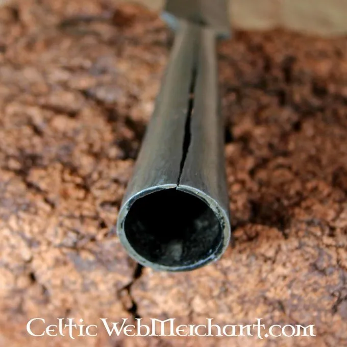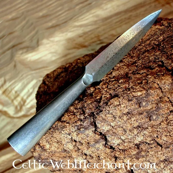 En masse tidlig middelalder spydhoveder var lavet af damaskusstål. Spidsen blev lavet af flere lag stål, der blev vævet sammen. Denne spydhoved er autentisk lavet. Det er en kopi af en 6. århundrede South germansk spydhoved, men lignende originaler forekom indtil det 10. århundrede.