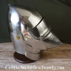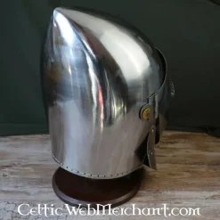 Denne middelalderlige bascinet er en kopi af en tidlig 15. slutningen af det 14. århundrede originalen. Bascinetter som dette blev båret over hele Europa i løbet af det 15. århundrede. denne bascinet blev oprindeligt fremstillet i Italien. Denne luksuriøse hounskull bascinet har en bevægelig beskyttelse hals. Visiret er tilspidset til at aflede slag. Denne bascinet kan let forsynes med en suspension til en brynjekrave.