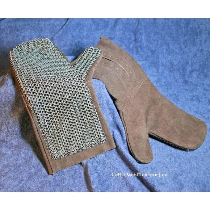 Disse kæde mail handsker er lavet af sort ruskind med vævet ringbrynje ringe på toppen. Kæden mail på bagsiden af hånden har en ulden polstring nedenunder for ekstra beskyttelse. De gathered ringe er 1,6 mm tyk og har en indvendig diameter på 6 mm.