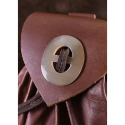 Materiale: læder, horn / Farve: rød brun / Højde: 15 cm / Maks. bæltebredde: 6,5 cm / Baseret på en historisk original