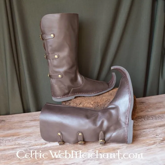 Disse støvler kan nemt fastgøres med de medfølgende stropper. De fås i flere størrelser og er fremstillet af 2 mm tykt kohud. Sålene er lavet af hårdt gummi.