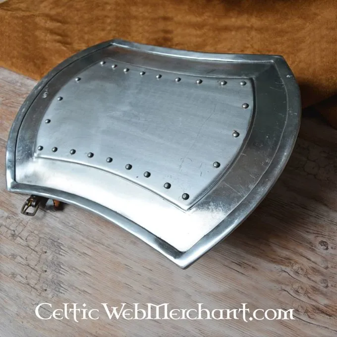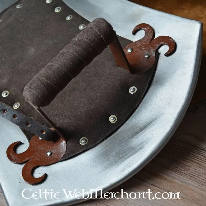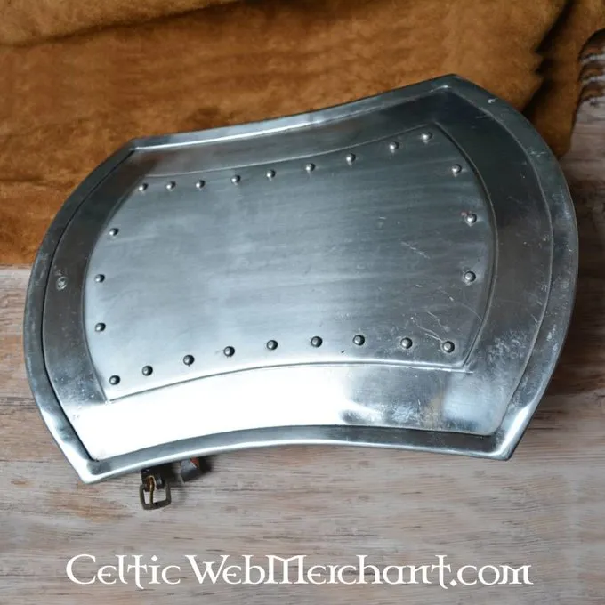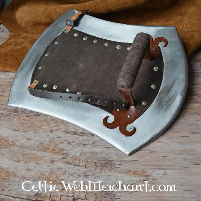 Denne firkantede bukkel er perfekt til at afbøje våben af modstanderen. Det er 2 mm tyk, vejer 2,3 kg og måler 41 x 27 cm