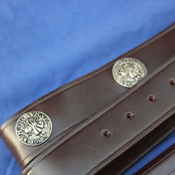 En smuk middelalderlig sværd ved Ankerspil Steelcraft baseret på middelalderlige sværd anvendes af bekendtgørelse af Tempelridderne. Tempelridderne var en middelalderlig ridderorden, der gik i krig til det Hellige Land. Med hensyn til struktur, deres rækkefølge lignede en munkeorden. Adskillige berømte middelalderlige historiske tal var tempelridderne, ligesom Godfrey de Bouillon og Hughes de Payens. Tempelridderne Swords blev dekoreret med religiøse symboler i bekendtgørelsen af ??Tempelridderne. Den Templar kors er afbildet på klingen, knop og cross-vagt af denne replika sværd. Pommelen viser en mønt dedikeret til templar knight Bohemond II. De tværgående vagt viser en tekst på begge sider: Kristus Vincit og Kristus regnat. Dette betyder: Kristus har overtaget og Kristus regler. Dette viser den urokkelige tro af templet riddere i Kristus og troen på deres mission. Sværdet har en dyb fyldigere, så det har en ganske let vægt. Grebet er omviklet med brunt læder i et kryds motiv. Sværdet leveres inklusive en smuk middelalderby skede med sværd bælte, så du kan bære den rundt om taljen. Skeden er dekoreret med Templar sæler og Templar kors. En dejlig sværd til på væggen eller til reenactment. Når bluntened, det er en fremragende kamp klar sværd til sværdkamp og en perfekt træning sværd for historisk europæisk kampkunst.