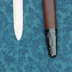 Denne replika sværd er baseret på historiske sværd fra det niende århundrede, vikingetiden. Vikingerne velanskrevne styrke og magt, i den tidlige middelalder vikingerne plyndrede klostre og andre steder af rigdom som Lindisfarne. Samtidig, vikingerne var også landmænd, især opportunister, der havde at leve i vanskelige og kolde områder og var altid på udkig efter bedre steder at bo. Den niende århundrede var også det århundrede, hvor danske vikinger søgte lykken i England. I 871 kæmpede de en stor kamp mod Prince Alfred, senere kendt som Alfred den Store, der ledede hær af kong Æthelred af Wessex. Vikingerne tabte denne kamp, ??men i resten af ??århundredet, de ville vende tilbage til denne lovende jord at erobre dele af det. Dette sværd har en smuk segmenteret greb med brunt læder, et typisk Viking pommel og en cross-vagt med knude motiver fra vikingetiden kunst. Den sværdknop og vagt er patineret, så det ligner en rigtig antikke gamle sværd. Sværdet har en lang, bred fyldigere, så det er helt let i vægt og har en fremragende balance. Det føles godt i hånden. Den leveres med en meget luksuriøse skede med messing skede spids og et sværd bælte, så du kan hænge den rundt om taljen. Den semi-skarp klinge er smedet fra 1065 kulstofstål og hærdet med en hårdhed på 48-52 HRC. Dette sværd er et smukt sværd til væggen i dit eget Viking hal og fantastisk til din Viking kostume eller Cosplay fra vikinger eller Last Kingdom. Hvis du blunten bladet, er det et perfekt sværd til sværdkamp, ??historisk europæisk kampkunst og Viking reenactment slag.